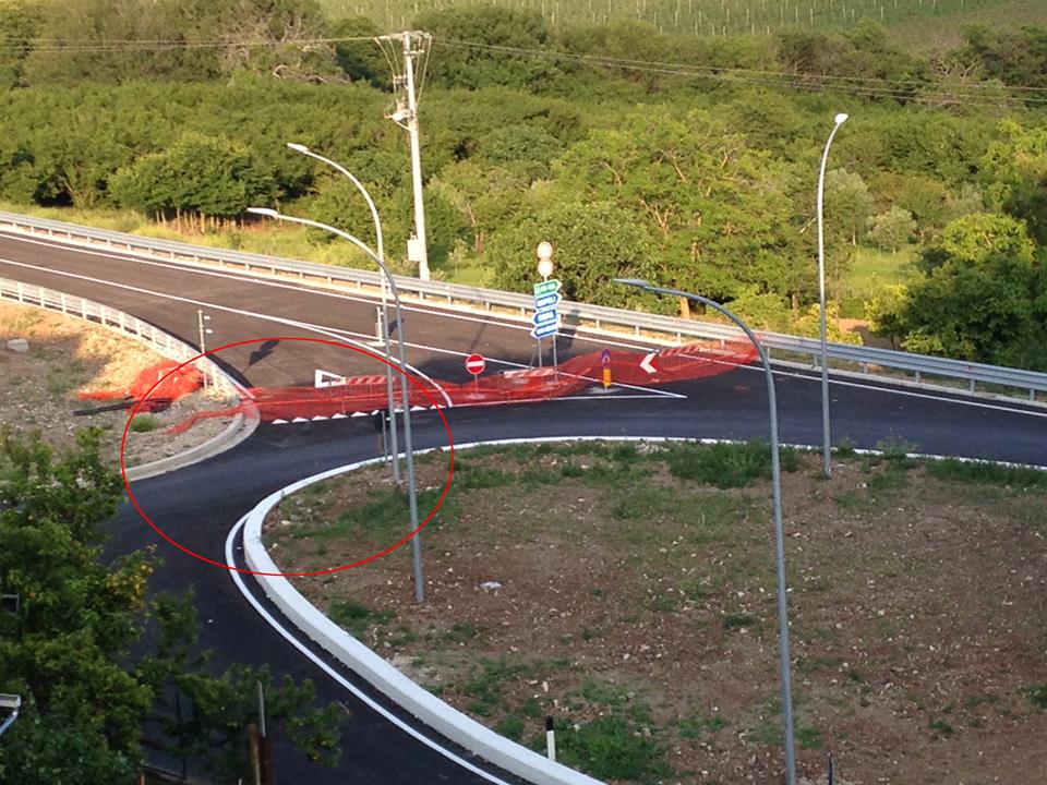 Nel punto della foto cerchiato in rosso la carreggiata è davvero molto stretta e, se è complicato per un’automobile effettuare la manovra di immissione nel senso rotatorio, non oso immaginare per gli autotreni che numerosi percorreranno quella strada. Ci chiediamo come mai i progettisti dell’Anas non abbiano fatto tali considerazioni e soprattutto perchè la rotonda non sia stata fatta più tondeggiante allargando così la carreggiata e agevolando la circolazione.” (cfr cliccare foto con indicazione in rosso )