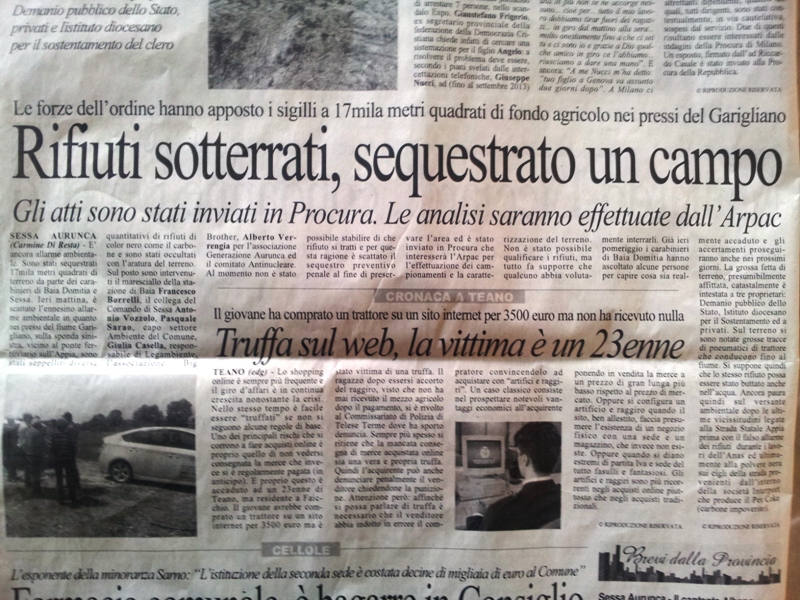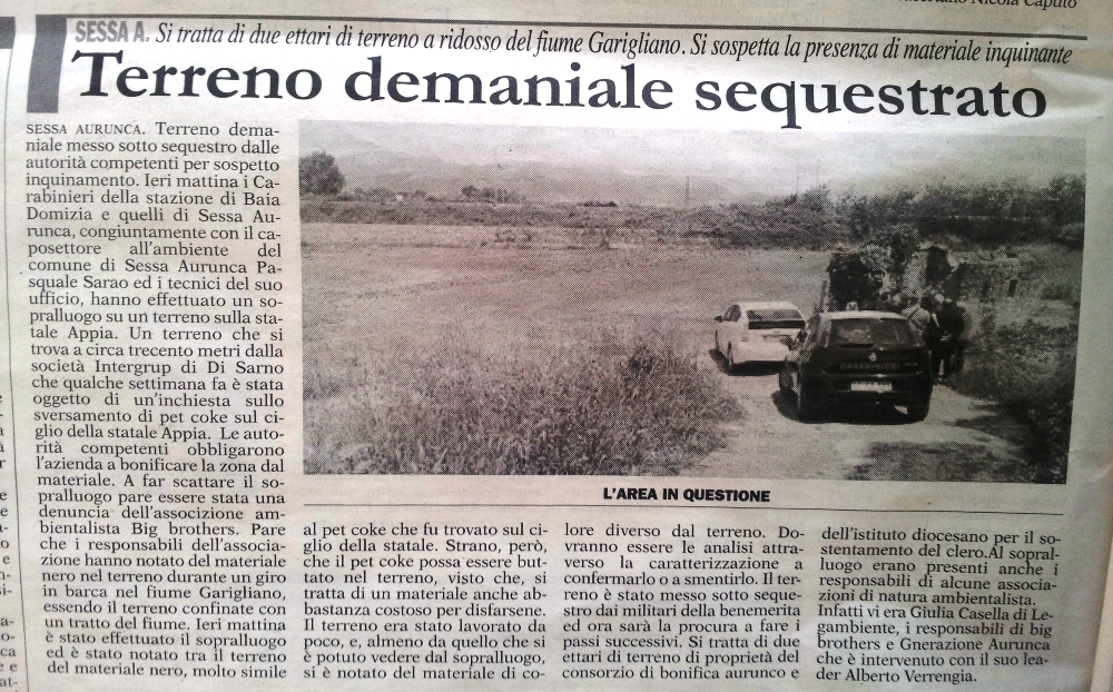 Alcuni organi di stampa, come h24notizie.com, efficiente servizio informativo del basso Pontino (che si sono occupanti della problematica Pet Coke), individuano proprio in questo materiale inquinante, quello presuntivamente presente nell’area sequestrata, come si può leggere nel seguente link: http://www.h24notizie.com/news/2014/05/12/video-petcoke-abbandonato-vicino-al-garigliano-carabinieri-sequestrano-larea/