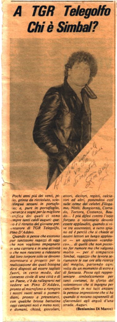 Giuseppe D’Addeo, in arte Pino Simbal, ha rappresentato un punto fermo della radiofonia, della televisione e della pittura della ridente cittadina aurunca. Si è spento il primo giorno dell’anno del 2019 a 72 anni, lasciando l’affettuosa moglie Lucia ed i due amati figli Gina e Gianpaolo. La sua carriera artistica è stata lunga ed apprezzata. Negli anni ’70 con la nascita delle radio private, Pino Simbal condusse con grande successo vari programmi radiofonici, i più famosi furono “Romantico jukebox” e “Gran Varietà” entrambi sulla sua amata Radio Circuito Solare. Contemporaneamente, Pino conduceva noti spettacoli dell’epoca come lo Zecchino d’Oro di Lauro il Cantabimbi di Roccamonfina. Pian piano emerse anche una sua altra passione: la pittura. Pino D’Addeo iniziò a dipingere quadri di notevole spessore artistico.